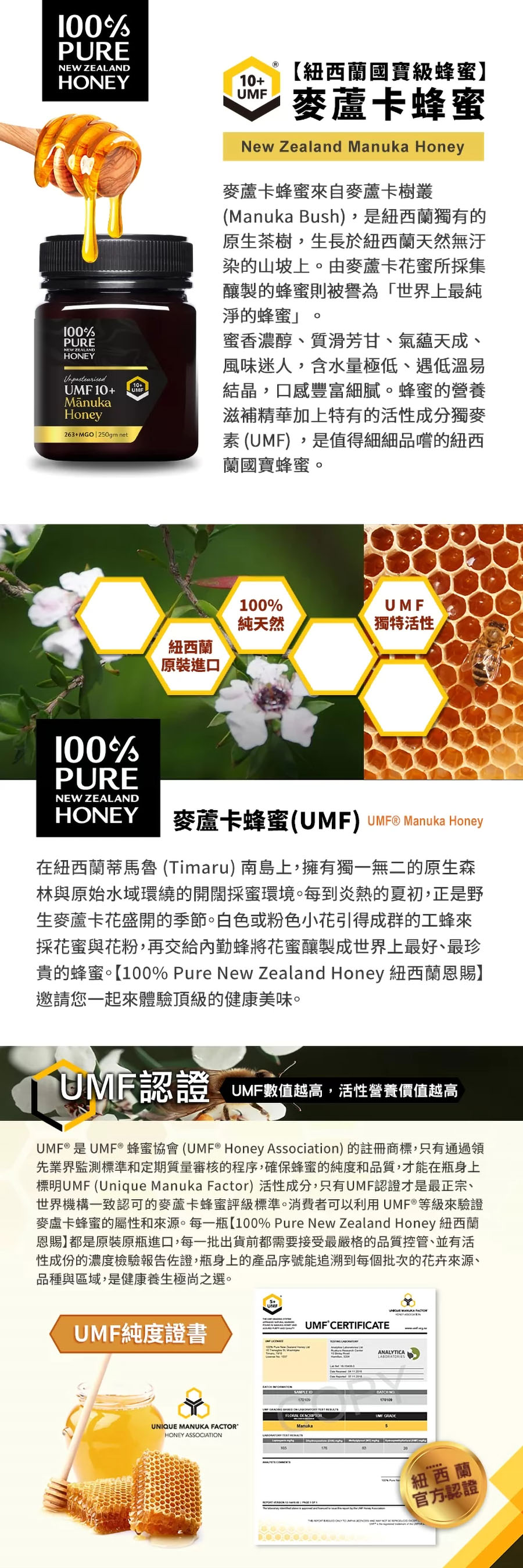 蜜香濃醇、質滑芳甘、氣蘊天成、風味迷人,含水量極低、遇低溫易結晶,口感豐富細膩。蜂蜜的營養滋補精華加上特有的活性成分獨麥素(UMF),是值得細細品嚐的紐西蘭國寶蜂蜜。