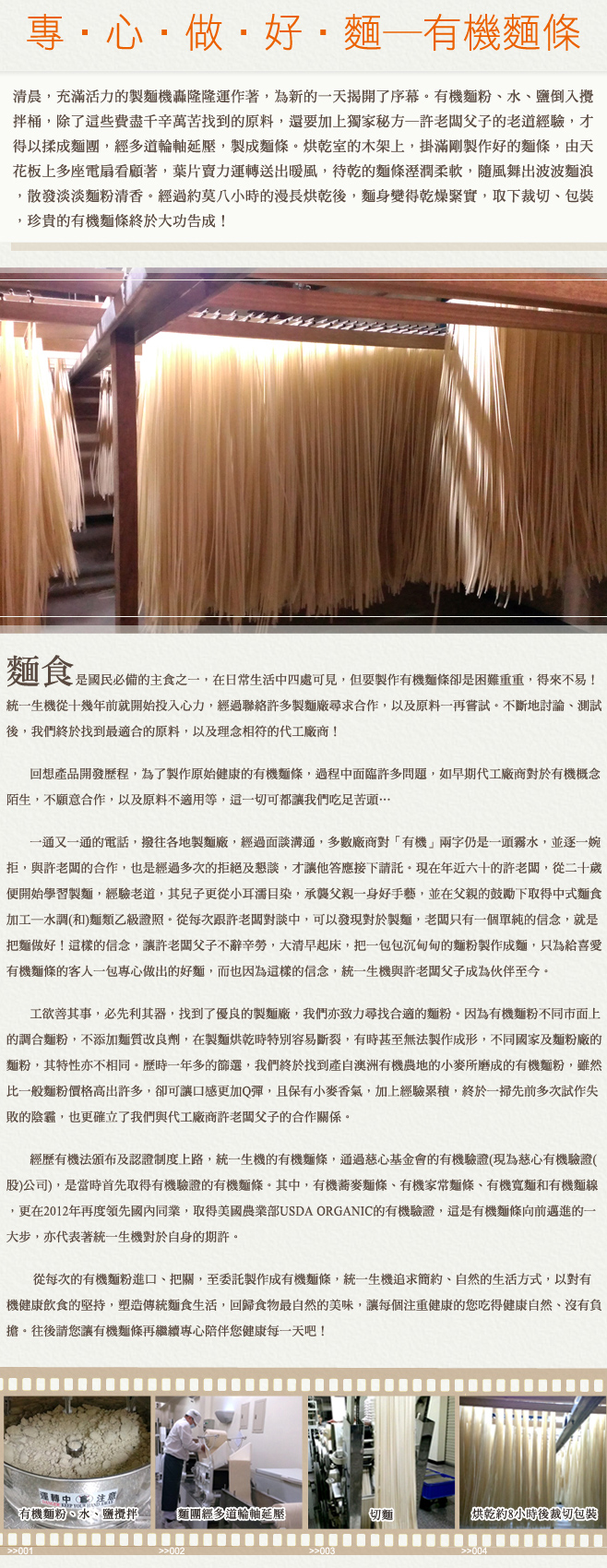 採用澳洲麵粉製作之有機麵條,經慈心有機驗證,不添加防腐劑跟漂白劑,保留麵條原本風味與營養,讓您吃出健康好滋味。