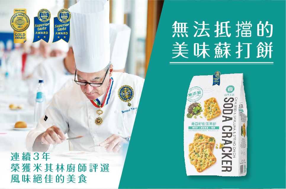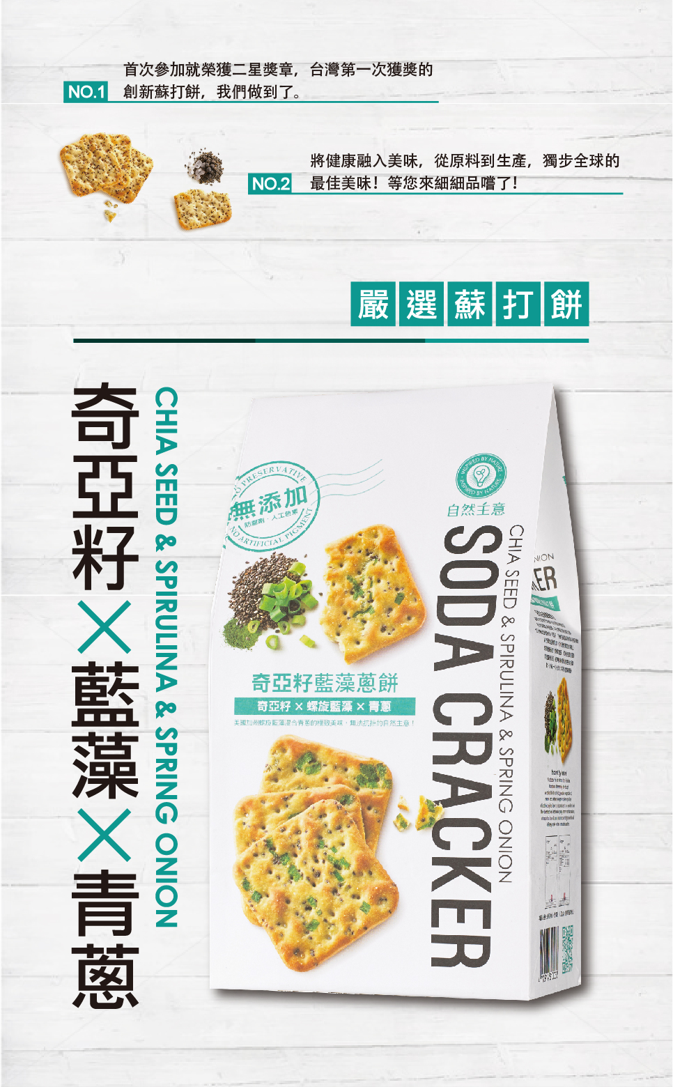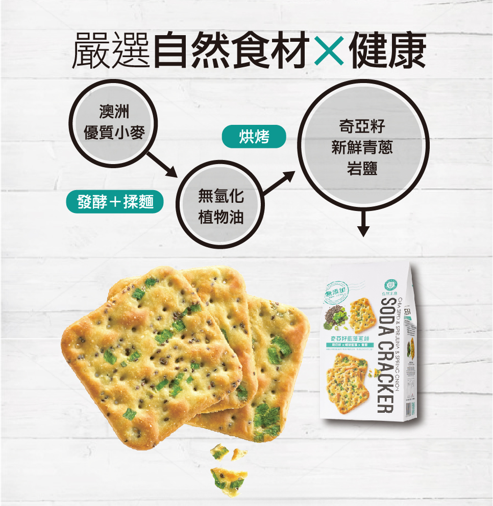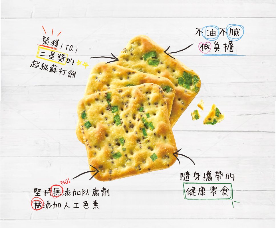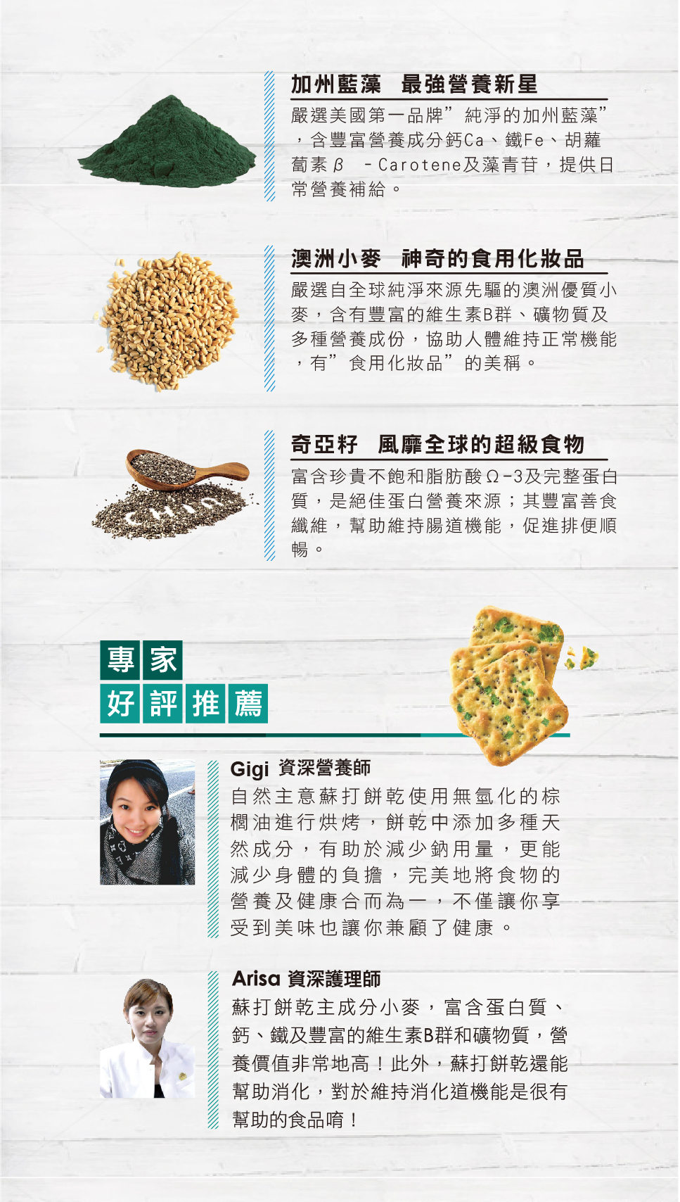 | 成份 | 小麥麵粉(無漂白)、棕櫚油(未氫化)、糖、奇亞籽(鼠尾草籽)、青蔥、岩鹽、藍藻粉(美國加州)、酵母粉、碳酸氫鈉(食用小蘇打) |